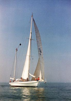 Links: Met de Zeevalk toonde Van de Stadt in 1951 met zijn winst in de Fastnet Race de superieure zeileigenschappen van een lichtgebouwde knikspant met gescheiden kiel en roer aan.